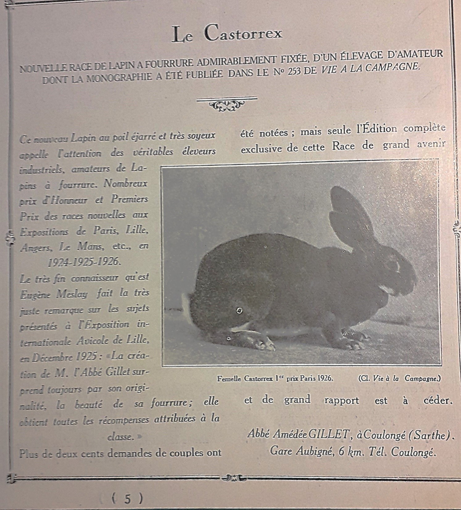Les premiers lapins Rex observés datent de 1919 : il s' agissait de Castorrex : lapin de couleur brune ayant un pelage semblable à celui du castor. Les premiers Castorrex apparurent donc en 1919 dans une ferme du département de la Sarthe, exploitée par un agriculteur, M. CAILLON. Les jeunes lapins, au nombre de deux, se distinguaient des autres par leur pelage particulier. Ces jeunes lapins, l'un mâle, l'autre femelle, étaient nés d'une même mère mais dans deux portées successives ; leurs frères de nichée avaient une apparence tout à fait normale. L' abbé GILLET, curé de Coulangé (Sarthe), s'en rendit acquéreur et soumit à une sélection sévère leurs descendants. Cette sélection dura quatre ans jusqu' au moment où la race à peu près fixée put être exposée au Concours Agricole de Paris sous le nom de Castorrex en 1924.